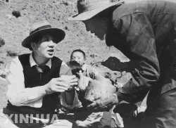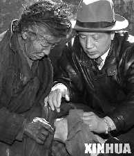 孔繁森(右)在西藏阿里日土縣過(guò)巴鄉(xiāng)為孤寡老人益西卓瑪治病