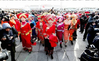 少數(shù)民族代表身著民族服裝步入會場。我國現(xiàn)行選舉法規(guī)定,人口特別少的民族至少應有一名代表。國務院新聞辦去年9月27日發(fā)表的《中國的民族政策與各民族共同繁榮發(fā)展》白皮書顯示,我國歷屆全國人民代表大會中,少數(shù)民族代表人數(shù)占全國人民代表大會代表總?cè)藬?shù)的比例,均高于同期少數(shù)民族人口占全國總?cè)丝诘谋壤?/p>