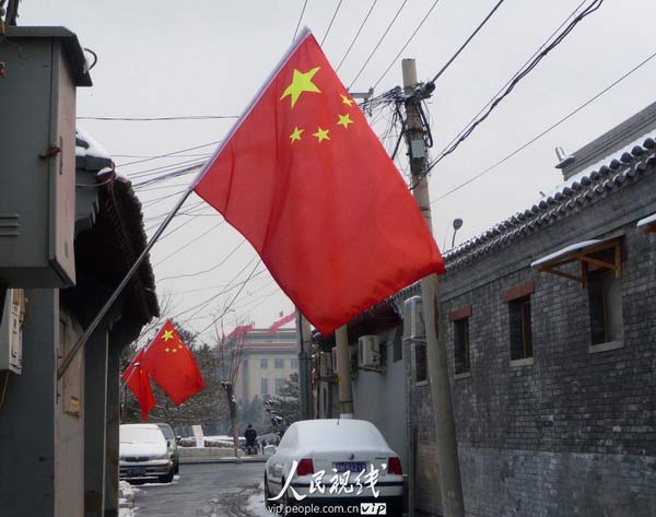 人民網(wǎng)訊 2010年3月8日,北京胡同,鮮艷的五星紅旗迎風(fēng)飄揚(yáng),成為“兩會(huì)”期間一道靚麗風(fēng)景,洋溢出熱烈喜慶的氣氛。(龔文豹/人民視線)