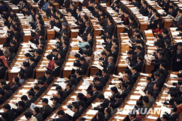 3月11日,十一屆全國(guó)人大三次會(huì)議在北京人民大會(huì)堂舉行第四次全體會(huì)議。這是代表在認(rèn)真聽(tīng)會(huì)。新華社記者陳樹根攝 |