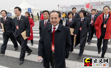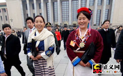 西藏自治區(qū)代表團(tuán)門巴族代表白丹措姆(前右一)和同伴走出會(huì)場。白丹措姆接受采訪時(shí)說:“曹建明檢察長的檢察院工作報(bào)告很好,聯(lián)系實(shí)際、內(nèi)容充實(shí)。檢察機(jī)關(guān)在西藏反分裂、維護(hù)穩(wěn)定、打擊犯罪等方面做出了積極的貢獻(xiàn)!备祩 攝