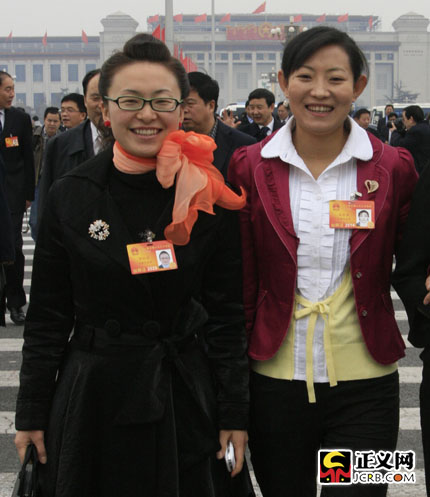 畢紅珍(左)與馬含嵐(右)在聽(tīng)取兩高工作報(bào)告的路上。畢紅珍告訴記者近幾年來(lái)檢察院一直郵寄給她們檢察工作材料,她們借此深入了解檢察院的工作,為更好履行代表職權(quán)而努力。程丁 攝