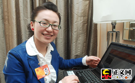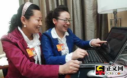 “八零后的代表知識(shí)涉及面廣,擅長(zhǎng)從網(wǎng)絡(luò)上獲得更多的信息與技術(shù),這是我們的特點(diǎn)!眱晌淮碚谟秒娔X查閱網(wǎng)絡(luò)上最受關(guān)注的議案。程丁 攝