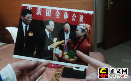 “看!這是溫總理3月6日來(lái)甘肅團(tuán)時(shí)拍的照片。當(dāng)時(shí),我正給溫總理送禮物,有土豆、玉米和農(nóng)村合作醫(yī)療本!碑吋t珍拿出照片展示給記者看。程丁 攝