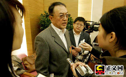 在北京市代表團(tuán)審議休息時(shí),柳傳志代表接受記者采訪。傅偉 攝