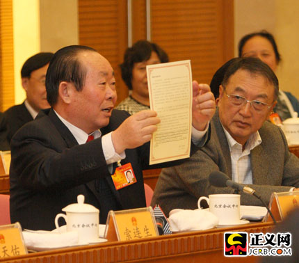 北京市房山區(qū)韓村河村韓建集團(tuán)黨委書記、董事長(zhǎng)田雄代表在稱贊?rùn)z察工作做得好時(shí),展示了檢察機(jī)關(guān)送給他的賀年卡。傅偉 攝