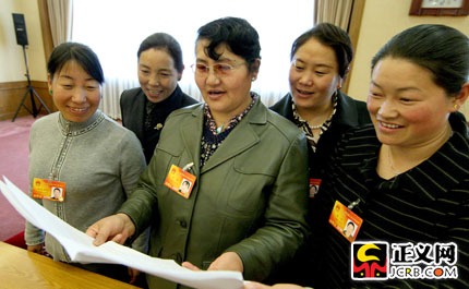 色珠代表和西藏自治區(qū)代表團(tuán)的姐妹們,認(rèn)真閱讀“關(guān)于修改選舉法的決定草案表決稿”。傅偉 攝