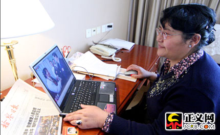 色珠代表向記者展示和中央領(lǐng)導(dǎo)同志的合影,感謝中央對(duì)西藏的親切關(guān)懷。傅偉 攝