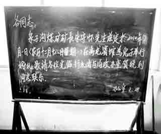 “各同志:泉子溝煤礦礦長(zhǎng)朱守懷先生茲定于2010年2月1日(農(nóng)歷十二月十八日星期一)在禹龍賓館為兒子舉行婚禮,敬請(qǐng)各位光臨。行禮者請(qǐng)與局政辦室賀曉利同志聯(lián)系!边@樣一個(gè)《通知》被寫在了陜西省韓城市煤炭局的黑板上(見下圖)。煤老板兒子結(jié)婚,陜西省韓城市有87名公務(wù)員送禮捧場(chǎng),甚至其中46人到場(chǎng)助陣。2月26日,陜西省渭南市紀(jì)委宣布處理決定:12名干部受到相應(yīng)處理。