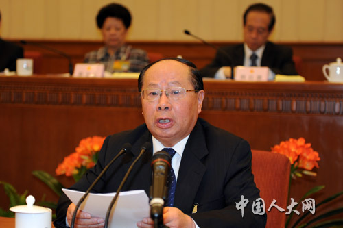 2月23日上午,十一屆全國人大常委會第十九次會議舉行第一次全體會議,全國人大常委會代表資格審查委員會主任委員黃鎮(zhèn)東作關于個別代表的代表資格的報告。中國人大網(wǎng) 王新慶攝