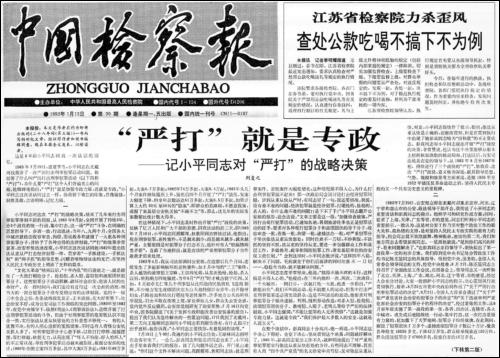 1992年1月13日,本報(bào)一版刊發(fā)的劉復(fù)之同志署名文章《“嚴(yán)打”就是專政――記小平同志對(duì)“嚴(yán)打”的戰(zhàn)略決策》一文。