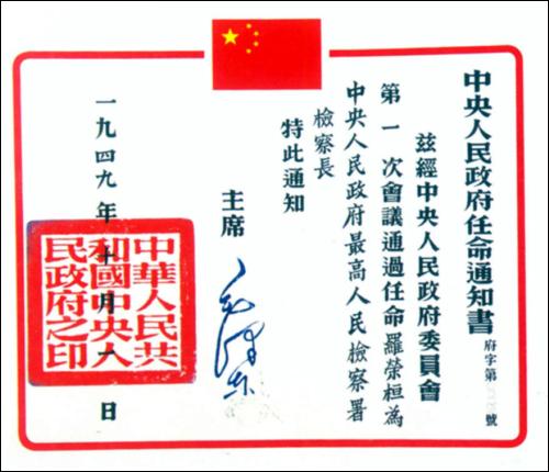 根據(jù)《中央人民政府組織法》的規(guī)定,中央人民政府委員會組織最高人民檢察署,作為國家的最高檢察機關(guān)。最高人民檢察署檢察長、副檢察長和委員均由中央人民政府委員會任免。1949年10月1日,中央人民政府委員會第一次會議任命羅榮桓為最高人民檢察署檢察長。