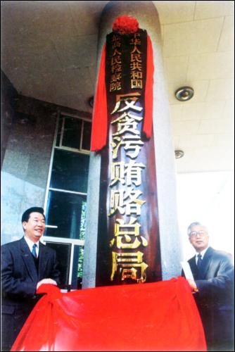 最高人民檢察院檢察長(zhǎng)張思卿(右)、常務(wù)副檢察長(zhǎng)梁國(guó)慶(左)出席最高人民檢察院反貪污賄賂總局揭牌儀式。