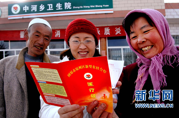 這是寧夏固原市原州區(qū)中河鄉(xiāng)衛(wèi)生院醫(yī)生張玉蓮(中)在給村民介紹新型農(nóng)村合作醫(yī)療證(2007年1月13日攝)。