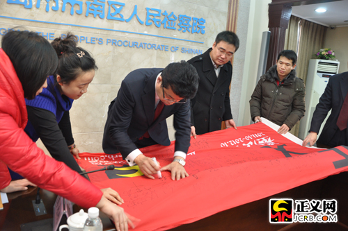 市南區(qū)檢察院檢察長(zhǎng)陶衛(wèi)東在正義基層行旗幟上簽字。姬剛 攝