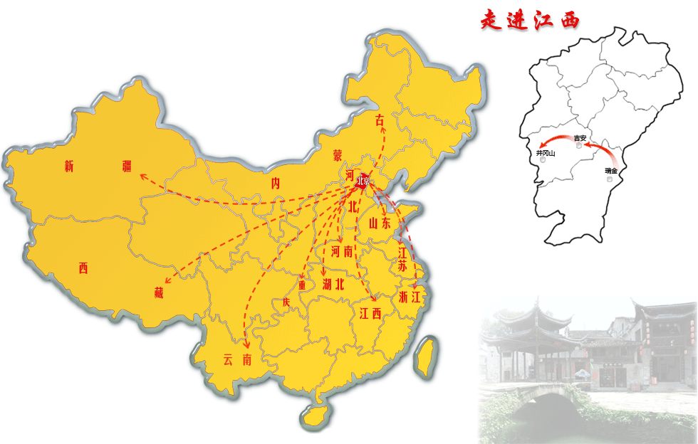 瑞金,位于江西省東南邊陲,因地產(chǎn)黃金,金為瑞,故名。江西瑞金是一片具有光榮革命歷史的紅土地。20世紀(jì)30年代,中國(guó)共產(chǎn)黨領(lǐng)導(dǎo)創(chuàng)建以瑞金為中心的中央革命根據(jù)地(中央蘇區(qū))。井岡山既是一個(gè)旅游勝地,亦是一處革命圣地。從這里燃起的星星之火,后來(lái)蔓延成熊熊烈焰,最后紅遍了全中國(guó)。