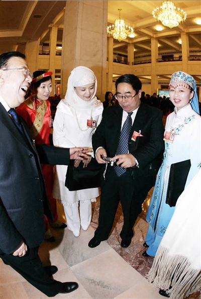 在十一屆全國人大代表中,全國55個少數(shù)民族都有本民族的代表,充分體現(xiàn)了全國56個民族的大團結(jié)。每一次相聚,談起家鄉(xiāng)的新變化,他們都有新的感受、新的愿望,彼此會送上新的祝福。圖為3月9日上午十一屆全國人大二次會議第二次全體會議開始前,漢族代表和少數(shù)民族代表合影后欣賞照片! ”緢笥浾吒祩z