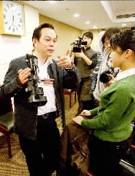 “上世紀(jì)90年代我就扛過大機器!這個機器,扛起來就會用。別走別走,把名片留下來,制作字幕要用!(見圖①)半小時后,拿著記者們的名片,關(guān)上機器,張兆安代表離開了會議室。