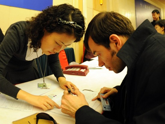 3月2日,一名外國(guó)記者(右)在辦理兩會(huì)采訪證。